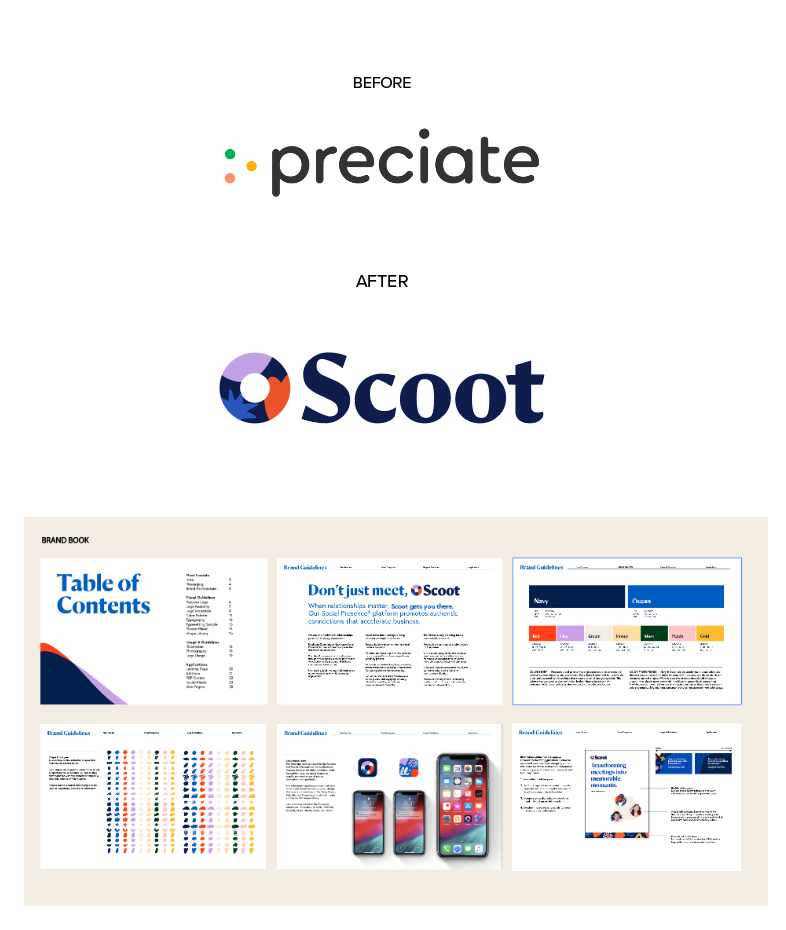 The Scoot identity celebrates interaction in virtual space. Warm neutrals anchor electric primary hues and kinetic shapes that echo the fluidity of human connection. The Bubble emblem represents freedom of movement, while dynamic forms create kaleidoscopic collages that energize static digital environments.